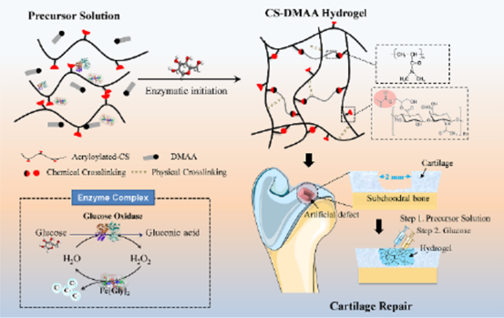 The efficient production of carbon free radicals and macromolecules helps to accelerate the polymerization automatically, which can be used to increase the soft tissue in bone defects. Copolymer hydrogel demonstrated the ability of cartilage regeneration. As the first example of in situ polymerization using artificial enzyme complexes, this work provides a bionic method for designing intensity adjustable hydrogels for biological implants and biological printing applications. The related papers were published in "Angewandte Chemie International Edition" under the title of tissue fluid triggered enzyme polymerization for ultrafast gelation and cartilage repair.