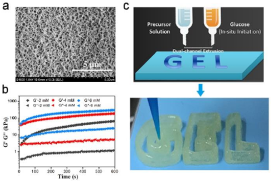 Fig. 1 SEM image of (a) CS-DMAA hydrogel. B) the time curve of CS-DMAA hydrogel during rheological test. c) Schematic and photographic images of a dual channel 3D printing process using precursor solution and glucose solution as ink.