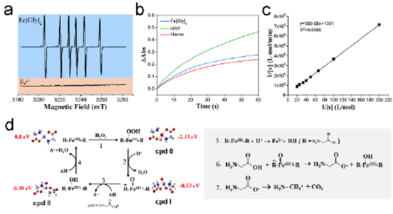 Fig. 3 (a) EPR spectra of carbon radicals formed by GOx / Fe [Gly] 2 and GOx / Fe2 + in the presence of glucose (b) enzyme kinetic curves of Fe [Gly] 2, HRP and hemin under the same reaction conditions c) Lineweaver Burk diagram of Fe [Gly] 2 as HRP simulant d) The proposed catalytic mechanism of Fe [Gly] 2 and the production mechanism of carbon free radicals.