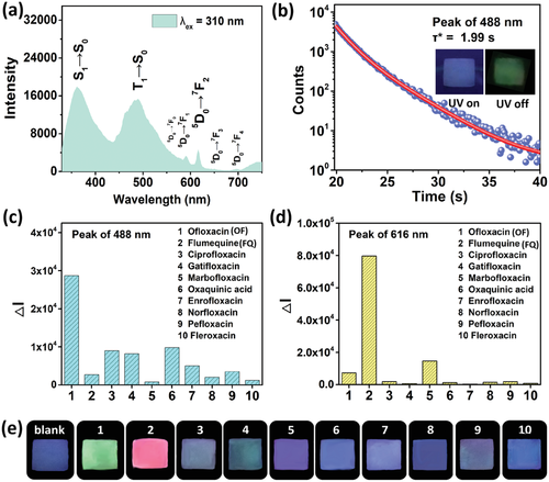 Fig. 2a) 1 emission spectrum. b) The RTP decay lifetime of 488 nm emission peak of 1. c) T1 → S0 emission histograms of 1 in various QL solutions. d) In various QL solutions, the histogram of 5d0 → 7f0 emission of 1. e) The photo of 1 was taken from various solutions under 310 nm UV lamp.
