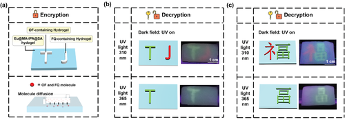 Fig. 6 A) based on the membrane anti-counterfeiting platform containing 1, OF- and FQ hydrogel, the "TJ" encryption process is displayed through molecular diffusion process. b) Based on the film anti-counterfeiting platform in Figure 1, the "TJ" decryption process is shown( λ Ex = 310 nm) and "t" secondary decryption process( λ ex=365 nm)。 c) The film anti-counterfeiting platform based on 1 shows the decryption process of "Fu"( λ Ex = 310 nm) and the second decryption process( λ ex=365 nm)。