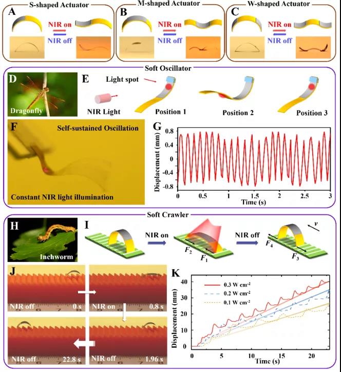 The shape deformation and time programming function of lm-lcn actuator driven by NIR are attributed to the excellent photothermal conversion efficiency of embedded minignr-cooh and the selective coating characteristics of colloidal LM ink. The programmable deformation ability of lm-lcn brake can be realized by coating colloidal LM ink on the selected area on the plane side of LCN film arranged obliquely (as shown in Fig. 2). When the nanostructured colloidal LM coating is only deposited on one side, middle and both ends of LCN film, the reversible S-shaped, M-shaped and W-shaped driving can be obtained under NIR light irradiation, respectively. Inspired by the oscillation phenomena in nature, such as dragonfly wings, researchers developed a NIR photo fuel lm-lcn self-sustaining soft oscillator with a frequency of about 8.0 Hz by depositing a colloidal LM coating on one side of the LCN film, based on the self shadowing mechanism caused by photothermal and optical bending deformation. The researchers further mimic the inchworm crawling in nature. In the light on / off cycle, they show a light driven soft robot crawler, which is made of the center pattern lm-lcn translocated on the ratchet substrate. Under the irradiation of NIR, lm-lcn actuator moves forward because of the different friction between the front and back edges when LCN surface bends downward (F1 > F2). After closing NIR, the LCN strip elasticity recovers, and the leading edge bears large friction (F4 > F3) to make the rear track move forward. In addition, it is found that the crawling speed of lm-lcn actuator is closely related to the intensity of infrared light. When the intensity of 808 nm infrared light is 0.1, 0.2 and 0.3 Wcm-2, the average crawling speed of lm-lcn actuator is 1.17, 1.51 and 1.75 MMS-1, respectively.