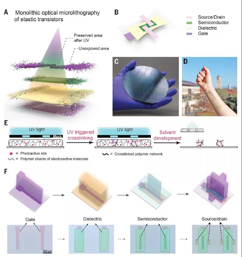 An efficient photoinitiated carbene insertion reaction was used as a general crosslinking method for semiconductor and insulating polymers (Fig. 1E). In addition, polyethylene glycol acrylate (pegdma), which is sensitive to ultraviolet light, is introduced to realize the double network mediated direct photolithography (no chemical modification) of conductive polymer. The device can be manufactured in four direct lithography steps without additional protection, etching, transfer or lamination processes (Figure 1F). The cross-linking based patterning strategy makes each layer stable and chemically resistant, allowing wafer scale layer by layer deposition.