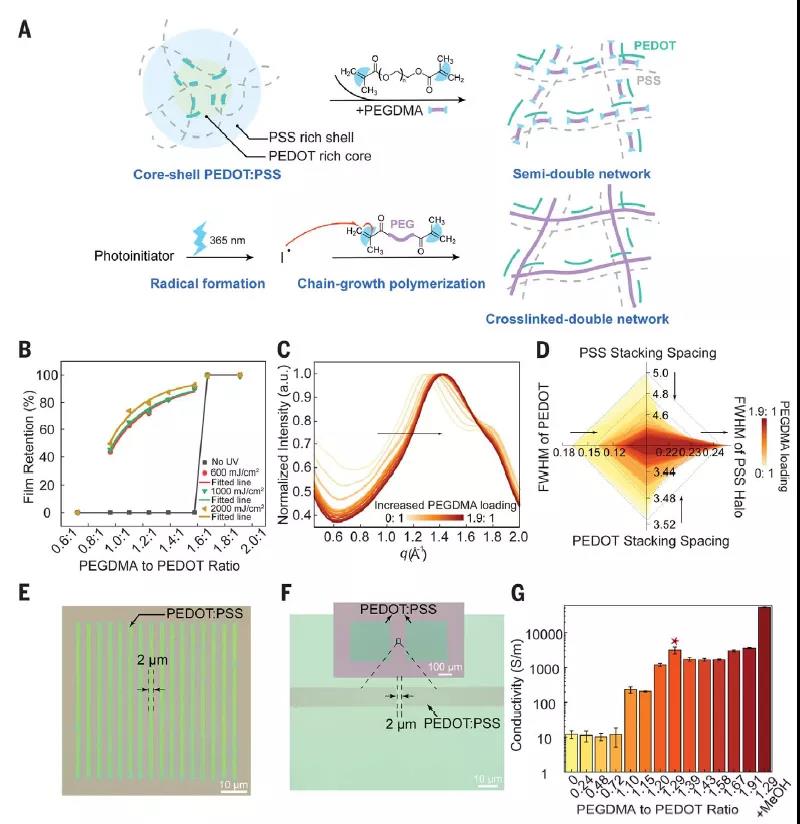 The solubility of PEDOT: PSS can be achieved by embedding physical crosslinking conductive network into covalently crosslinked pegdma network. The strong interaction between PEDOT and PEG linker results in the transition of the microstructure of PEDOT: PSS from core-shell structure to longer chain, thus forming the first conductive network (Fig. 2a). After UV irradiation (365 nm), the second network was formed by rapid radical polymerization of polyethylene glycol modified by dimethyl acrylate (DMA). The strong intermolecular interaction between the two networks makes the area exposed to UV resistant to water, while the unexposed area is still water-soluble. This photopatterning ability is closely related to the ratio of pegdma / PEDOT. Insufficient pegdma will lead to poor corrosion resistance of the film, while excessive pegdma will lead to crosslinking before UV exposure (Fig. 2a, b). With the increase of PEG linker, the interchain coupling between PEDOT molecules is stronger, and PEDOT is more stable π-π The stacking distance decreases gradually and larger grains are formed (Fig. 2c, d). By adjusting the appropriate ratio (1.15:1 pegdma / PEDOT), the resolution of 2 μ M (Fig. 2E, f). In addition, the conductivity of PEDOT: PSS was greatly improved by adding pegdma.