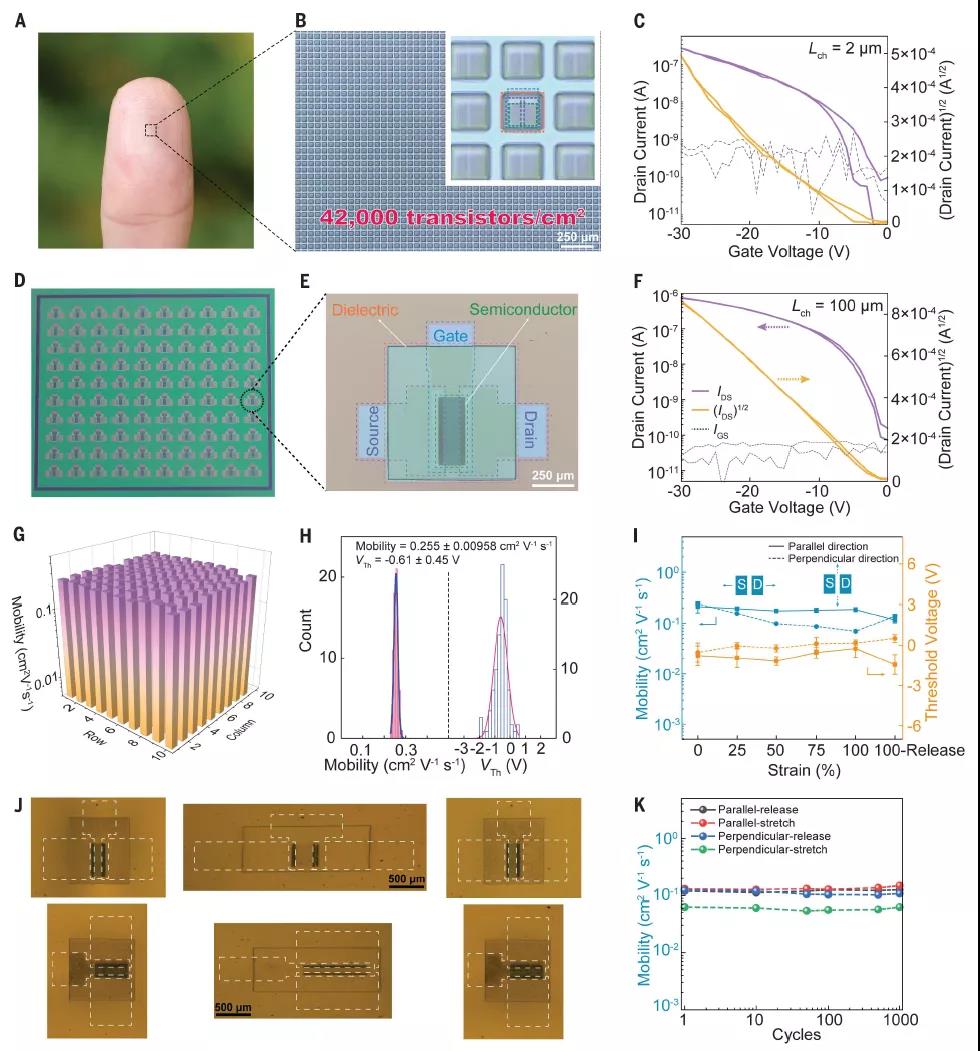 The researchers fabricated an all polymer elastic transistor array with 10000 transistors on a 0.238 cm2 substrate (FIG. 4A, b). The device density is as high as 42000 transistors per square centimeter, which is more than 100 times of the density of the array prepared by mask etching process. Device channel length 2 μ m. Width 40 μ m。 The switching ratio is 104 and the off state current is as low as 0.5 Na (Fig. 4C). Subsequently, 10 samples were prepared × The average saturation mobility is 0.255 M2 V – 1 s – 1 (Fig. 4F). The device yield is 98.5%, and the standard deviation is only 3.76% (Fig. 4G). The distribution of threshold voltage (Vth) is 0.61 ± 45 V (Fig. 4h), which is only 1.5% of the operating gate source voltage window (30 V). At 100% strain parallel to and perpendicular to the charge transfer direction, the transistor array has no visible cracks or delaminations (Fig. 4J), which confirms that each layer has excellent mechanical properties. Its electrical properties are stable along the charge transport direction and under 100% strain. The mobility is kept at 88% of the original value and the threshold voltage is close to 0V (Fig. 4I). In the vertical direction, the mobility decreases slightly. Under 50% strain in both directions, it can withstand 1000 times of repeated tension without obvious change in electrical properties (Fig. 4K).
