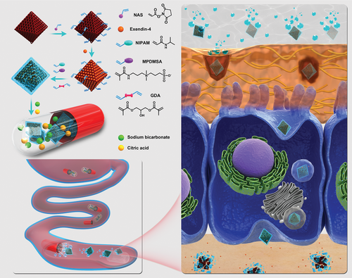 Diagram 1 contains Ex@MIL101 @Graphical representation of gel ± nanoparticles for oral exendin-4 delivered pH triggered self unpacking capsules. The hydrogel MOF nanoparticles containing exendin-4 were obtained through the free radical copolymerization of acrylonitrile modified NH2-MIL101 nanoparticles, NIPAM and MPDMSA with GDA as crosslinking agent. The capsules protect the peptide loaded nanoparticles from the acidic environment of the stomach, and release them in the intestine to produce carbon dioxide bubbles to promote the movement of nanoparticles. The zwitterionic surface of nanoparticles further facilitates transport through the intestinal epithelium.