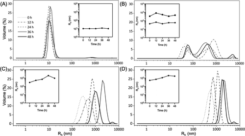 chart   5. Particle size distribution. Dynamic light scattering (DLS) measurements of the hydrodynamic radius (RH) distribution of collagen (a) VB, (b) e3-vb-k3, (c) e3-vbb-k3 and (d) e3-vbbb - were performed for more than 48 hours. The sample was kept at 4 ° C in 10 mM phosphate buffer at a concentration of about 1 mg / ml (pH 7.4). The illustration of each subgraph shows the change of the main RH peak (> 5% volume intensity) with time. In all subgraphs, the RH distribution curves at different times are shown in the right figure.