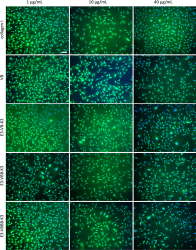 chart   7. The cells were spread on the plate coated with designed collagen. NIH / 3T3 mouse fibroblasts were seeded and spread on tissue culture plates coated with natural type I collagen (positive control), VB, e3-vb-k3, e3-vbb-k3 and e3-vbbb-k3 at concentrations of 1, 10 and 40 μ G / ml for 24 hours. The protein name and concentration are labeled on the left and top of the graph, respectively. The cells were stained with CFDA Se and Hoechst and observed with fluorescence microscope. The scale represents 100 of all images μ m