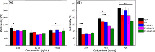 chart   eight   Relative cell viability on substrates composed of designed proteins of different (a) concentrations and (b) incubation times. The sample name is on the right. Natural type I collagen (black) was tested as positive control.