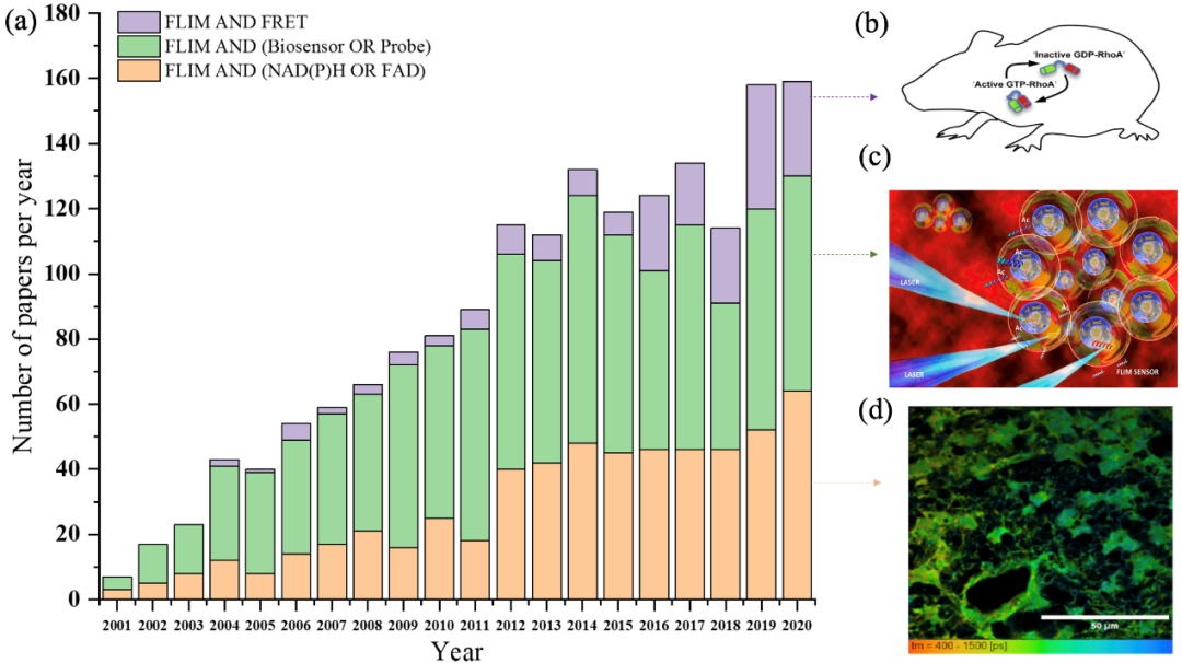 Figure 1. The number of publications combining NAD (P) h or fad (Orange), probe, biosensor (green) and FRET (purple) in flim field from January 2001 to December 2020 (data from web of science, January 2021)( a) Histogram of the number of papers in various fields from 2001 to 2020( b) RhoA FRET biosensor mice were used to monitor RhoA activity in mammalian tissues during development and disease progression( c) Under laser excitation, tcspc-flim biosensor was used to detect acetyltransferase activity in real time( d) Time resolved fluorescence images of NADH in glioblastoma stem cell (GSC) were obtained.