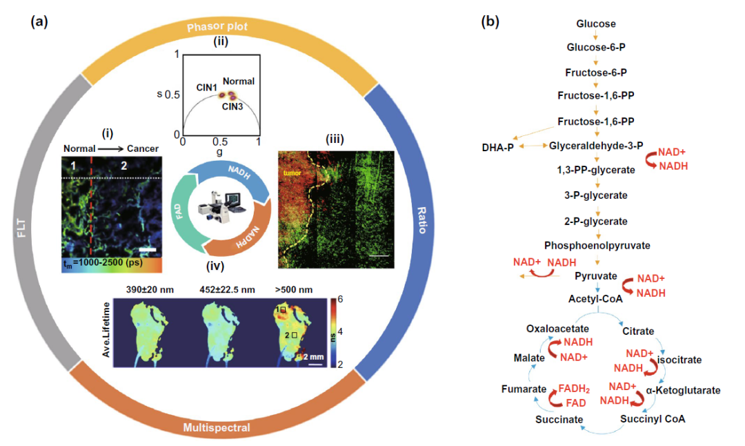 Figure 3. The study of flim binding NADH and fad autofluorescence and the changes of NADH and fad molecules in the core glucose metabolism pathway( A-I) based on the difference of fluorescence time, flim assisted lung cancer resection( A-II) flim phasor mapping assisted cervical precancerous lesions typing( A-III) NADH / NAD + ratio was used to assist the determination of tumor edge lesions( A-IV) multispectral flim assisted localization and typing of oral precancerous lesions( b) The changes of NADH and fad molecules in glycolysis and tricarboxylic acid cycle.