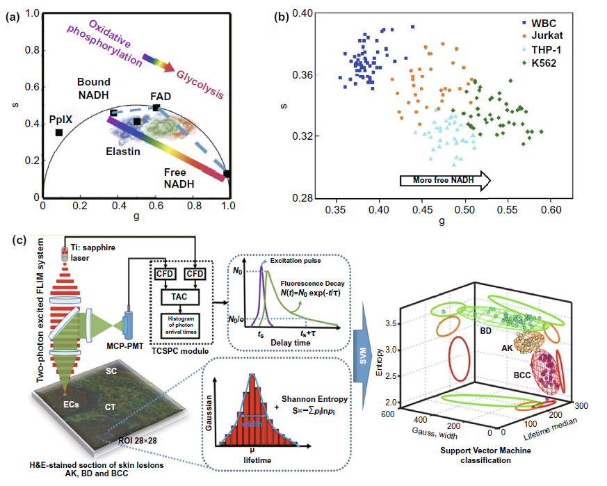 Figure 4. Flim phasor diagram and multi parameter flim classification system for cancer research( a) According to the principle of drawing flim phasor diagram, the information of metabolic changes such as cell oxidative phosphorylation and glycolysis in different samples can be obtained by analyzing the position of autofluorescence molecular phasor points in the phasor diagram( b) The cluster distribution of fluorescent molecules obtained from different samples in flim phasor diagram was used to reflect the differences of cell metabolism in different detection samples. Based on this, leukemia cell subtypes were classified and diagnosed( c) Support vector system was used to assist the diagnosis and classification of basal cell carcinoma (BCC), actinic keratosis (AK) and Bowen s disease (BD).