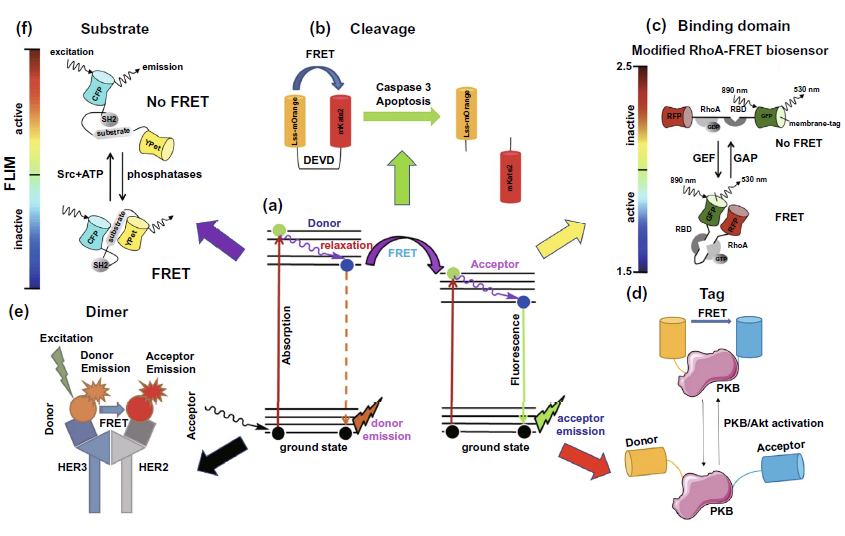 Figure 5. Application of FLIM-FRET in cancer diagnosis and efficacy improvement a) The model diagram of FRET phenomenon between donor and acceptor in FRET fluorescent molecular pair b) Cleavage type: the activity of Caspase-3 was detected by fret-flim, indicating the state of apoptosis c) Binding domain type: the activity of RhoA protein was detected by fret-flim, and the activity of RhoA protein was evaluated by whether FRET occurred between the linked RFP and GFP fluorescent protein molecules d) Tag type: the activity of PKB / Akt signaling pathway was evaluated by the change of FRET effect of serine and threonine fluorescent molecular markers linked to PKB protein e) Dimer type: the level of her3-her2 dimer on cell membrane was detected by FRET phenomenon of alexa546 and Cy5 fluorescent molecular pairs labeled on HER3 and HER2 f) Substract type: the activity of Src protein in cells was detected by the phenomenon that the FRET effect between CFP and ypet fluorescent protein molecules linked to the substrate disappeared after the reaction of SRC with the substrate.