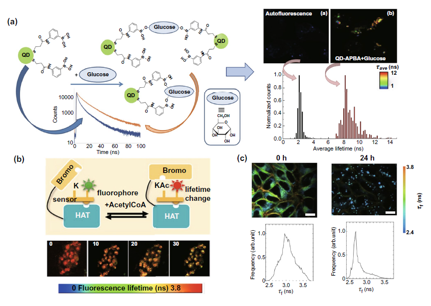 Fig. 6. Fluorescence labeled probe combined with flim to detect the changes of intracellular molecules a) Left: the schematic diagram of qd-apba probe detecting the glucose content in cytoplasm. Right: results of probe combined with flim cells b) A fluorescent labeled acetyltransferase biosensor combined with flim was used to detect the activity of acetyltransferase in the nucleus from the perspective of fluorescence time. The above figure is the experimental mechanism diagram, and the following figure is the experimental result diagram of flim biosensor detection after adding acetyltransferase activity inhibitor c) The lipid droplet imaging of HeLa cells treated with oleic acid in the time dimension of intracellular fluorescence was realized by using fluorescent labeled coumarin probe.