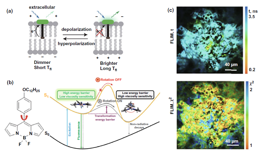 Since the changes of receptors on membrane detected by flim have been discussed in detail in the part of FLIM-FRET, this part mainly focuses on the application of flim combined with fluorescent probe to detect the potential of cell membrane and mitochondrial membrane and the changes of membrane viscosity. These parameters are related to cell membrane permeability and indirectly reflect cell activities such as malignant transformation. In the field of membrane potential measurement, the representative study selected in Fig. 7a is to use flim to detect the fluorescence time of voltagefluor fluorescent dye labeled probe. Due to the weakening of light induced electron transfer during membrane depolarization, the fluorescence time detected from hyperpolarization to depolarization will be prolonged. In the field of membrane viscosity measurement, fluorescent probes are mostly based on the boron chloride complex dipyromethyl structure (BODIPY) shown in the left figure of Fig. 7b. As shown in the right figure of Fig. 7b, when the viscosity of the membrane increases, the energy barrier from the planar configuration to the butterfly configuration of the fluorescent probe will be increased, resulting in the weakening of the non radiative pathway of the excited state returning to the ground state, thus enhancing the energy radiation pathway represented by fluorescence and prolonging the fluorescence time. Figure 7C shows the use of bodipy2 probe combined with flim to achieve flim imaging of CT26 tumor in vivo and detect the cell membrane viscosity.