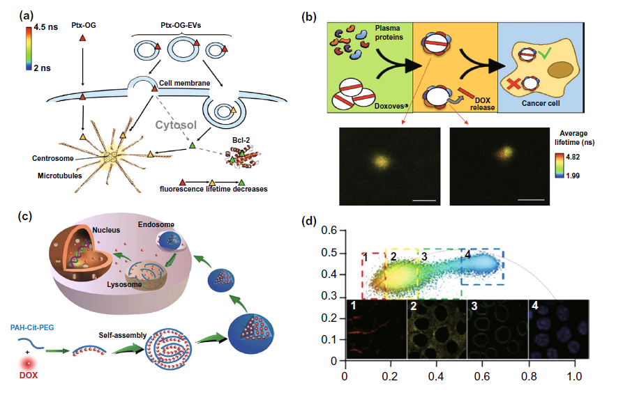 Figure 9. Flim monitoring adjuvant efficacy of anticancer drug delivery with fluorescence emission characteristics a) Flim was used to explore the mechanism of paclitaxel og loaded exosomes and vesicles b) Flim was used to study the leakage of drug carrier caused by biomolecular crown formation (BC) in liposome delivery strategy c) Mechanism diagram of a novel nano doxorubicin (DOX) drug delivery system PAH CIT DOX d) The distribution of DOX delivered by PAH CIT DOX strategy in cells was detected by using the pdlpi map detected by flim.