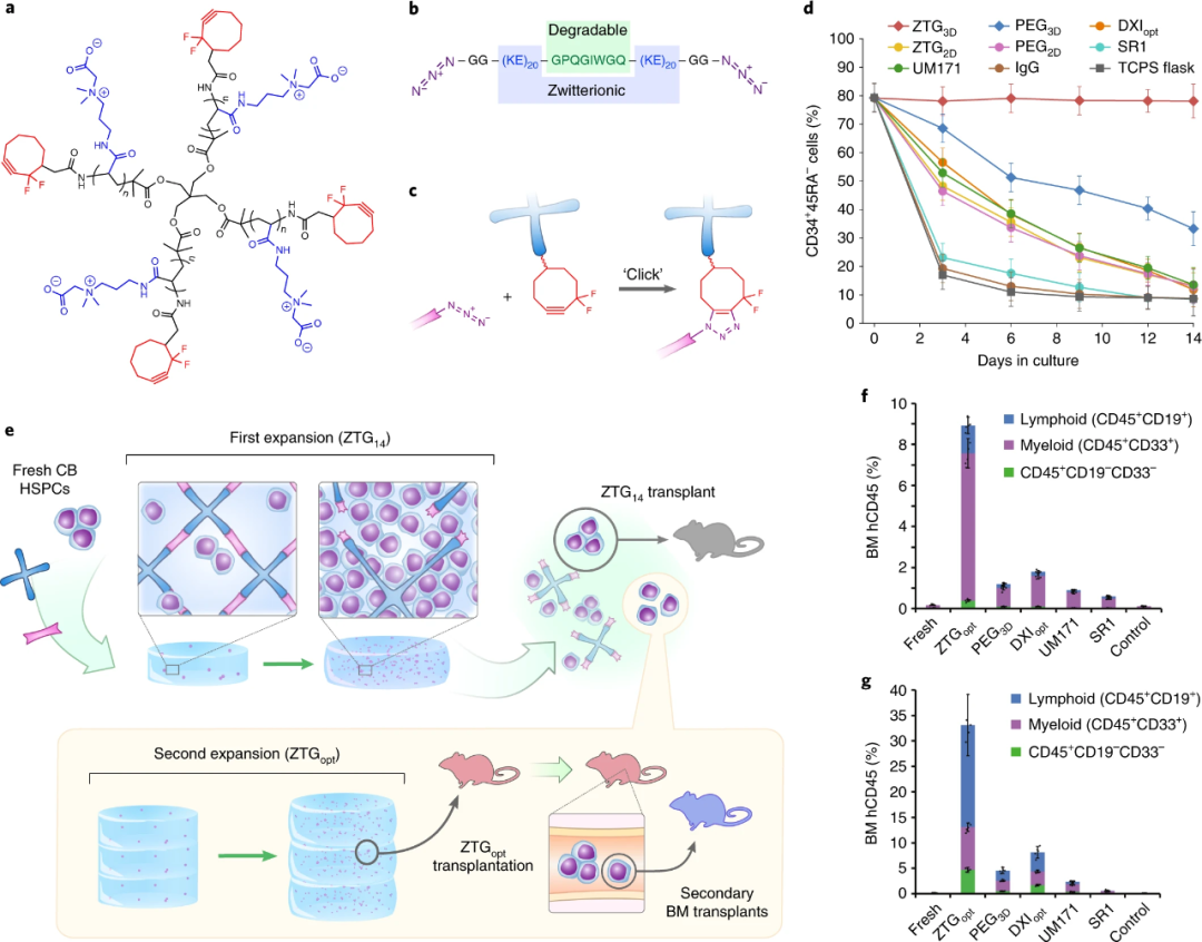 Researchers used terminal alkynes to modify the four-arm polycarboxybetaine acrylamide (pCBAA) and click chemistry between azide-modified peptide polymer (Azide–GG-(KE)20-GPQGIWGQ-(KE)20-GG-Azide) The reaction constructs a uniform 3D zwitterionic hydrogel network (hereinafter referred to as ZTG hydrogel), which is used to simulate the hydrophilic and zwitterionic cell membrane lipid-based 3D environment of HSPC living in the body. The schematic diagram of ZTG hydrogel cell culture research is shown in Figure 1e. Freshly separated HSPC from umbilical cord blood was mixed with ZTG to construct a hydrogel, and cultured in expansion medium for 14 d (ZTG14), with the best seeding density ZTG14 was allocated to a new zwitterionic gel for the second expansion, and then cultured for 10 days to obtain ZTGopt cells, and injected into immunodeficient NSG mice for primary (red mice) and secondary ( Blue mouse) bone marrow transplant. Experimental results show that CD34+ HSPC derived from umbilical cord blood is effectively amplified in ZTG hydrogel, and the amplified HSPC undergoes bone marrow transplantation, and it also shows good expansion performance in vivo.