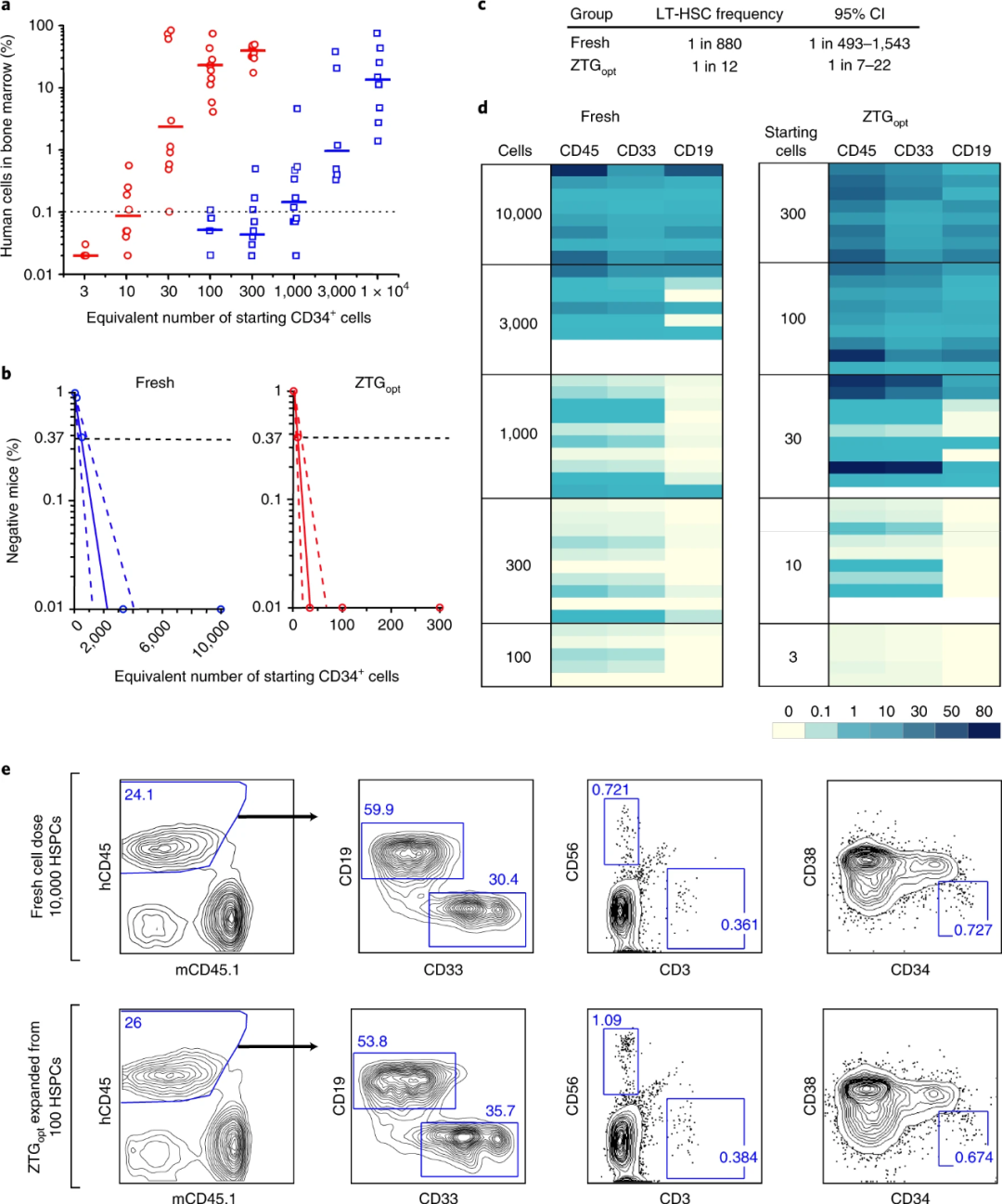 It has been proved that CD34 + HSPC derived from cord blood cultured in ZTG opt mode can maintain the expansion ability in vivo. Researchers have used limiting dilution analysis (LDA) to detect the expansion frequency of medium and long-term regenerative hematopoietic stem cells (LT-HSC) Happening. The experimental results are shown in Figure 3. After 24-30 weeks after transplantation, the amplification frequency of LT-HSC cultured in ZTG opt method is much higher than that of other culture methods. Both limiting dilution analysis and second transplantation experiments proved that ZTG culture expanded LT-HSC cells with long-term hematopoietic function.