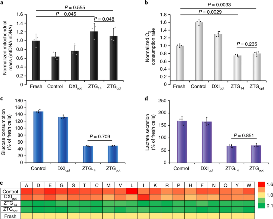 In addition, the researchers analyzed the mitochondrial mass and metabolic activity in cells cultured with ZTG14, ZTGopt and other amplification methods, and found that the mitochondrial mass in ZTG14 and ZTGopt cells increased slightly, which was in sharp contrast with the significant decline in DXIopt and the control group. Glucose consumption and lactate secretion were also much lower than DXIopt and the control group. The experimental results are shown in Figure 5, indicating that O2-related metabolism is inhibited in ZTG culture, and once again proves that the ZTG hydrogel 3D culture method maintains the original HSPC characteristics.