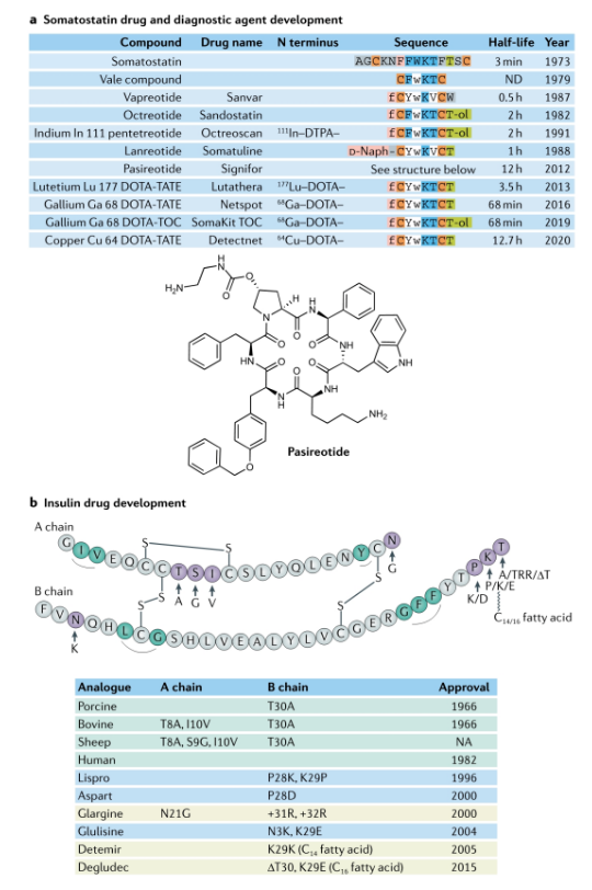 Peptide hormones are widely used clinically, but natural peptides are often not suitable for direct use as clinical drugs, especially in terms of pharmacokinetics. It is often necessary to improve their pharmacokinetic characteristics to facilitate administration and better simulate physiological secretion of hormone release curve. The following figure lists the optimization of somatostatin and insulin. Nordnorths new generation of weekly insulin Icodec has also entered Phase III clinical trials. Through fatty acid linkage modification and reduction of insulin receptor affinity, the half-life and dosing cycle are greatly extended.